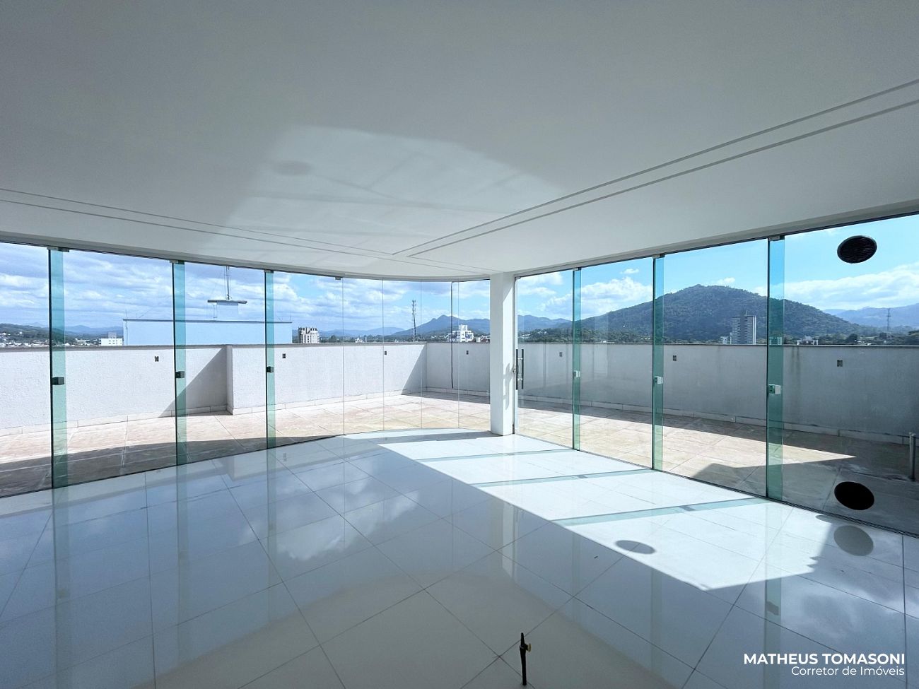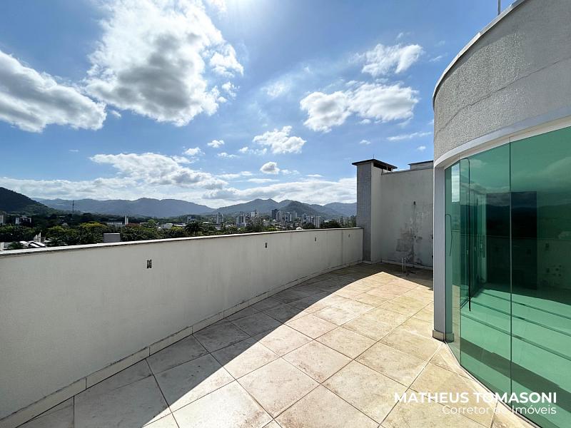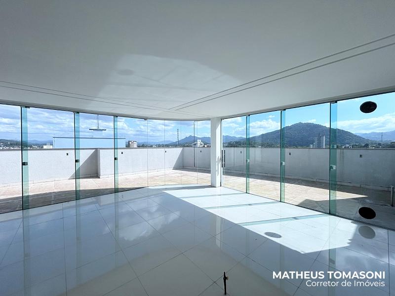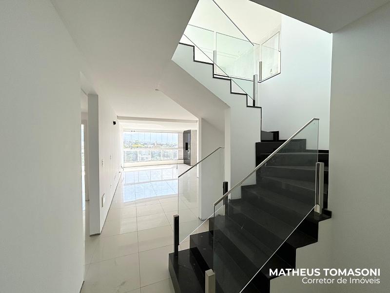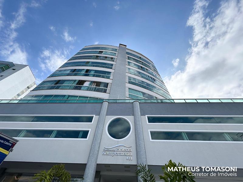 Cobertura duplex do Residencial Helena Kampermann, são 237m² de apto, nunca usado, na 8ª e 9ª laje do prédio, dispõe de living integrado com churrasqueira e fechamento em Reiki, área de serviço, lavabo, banheiro social e três suítes. No pavimento superior, uma ampla área de festas com banheiro e um terraço. Vista livre para o Centro.