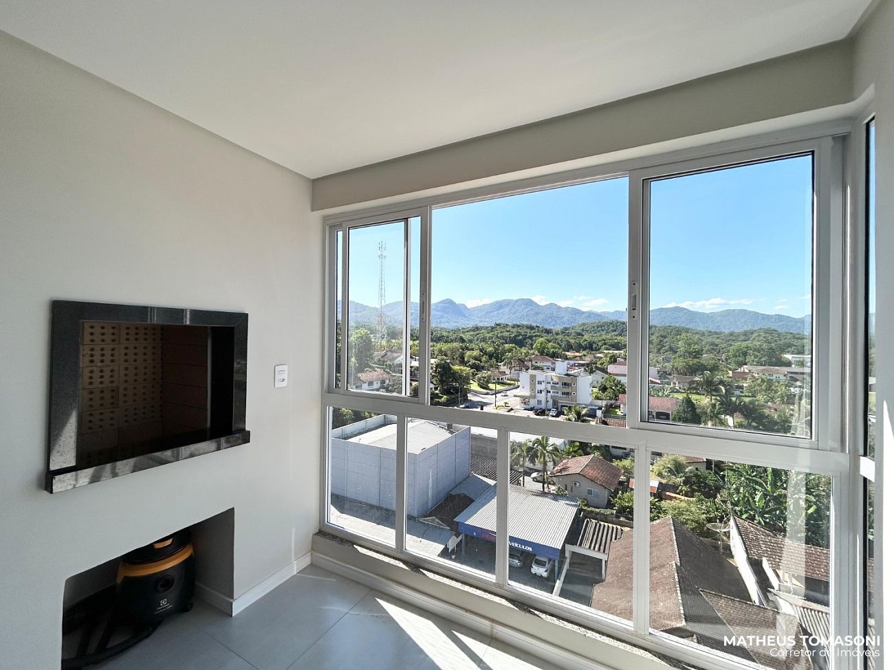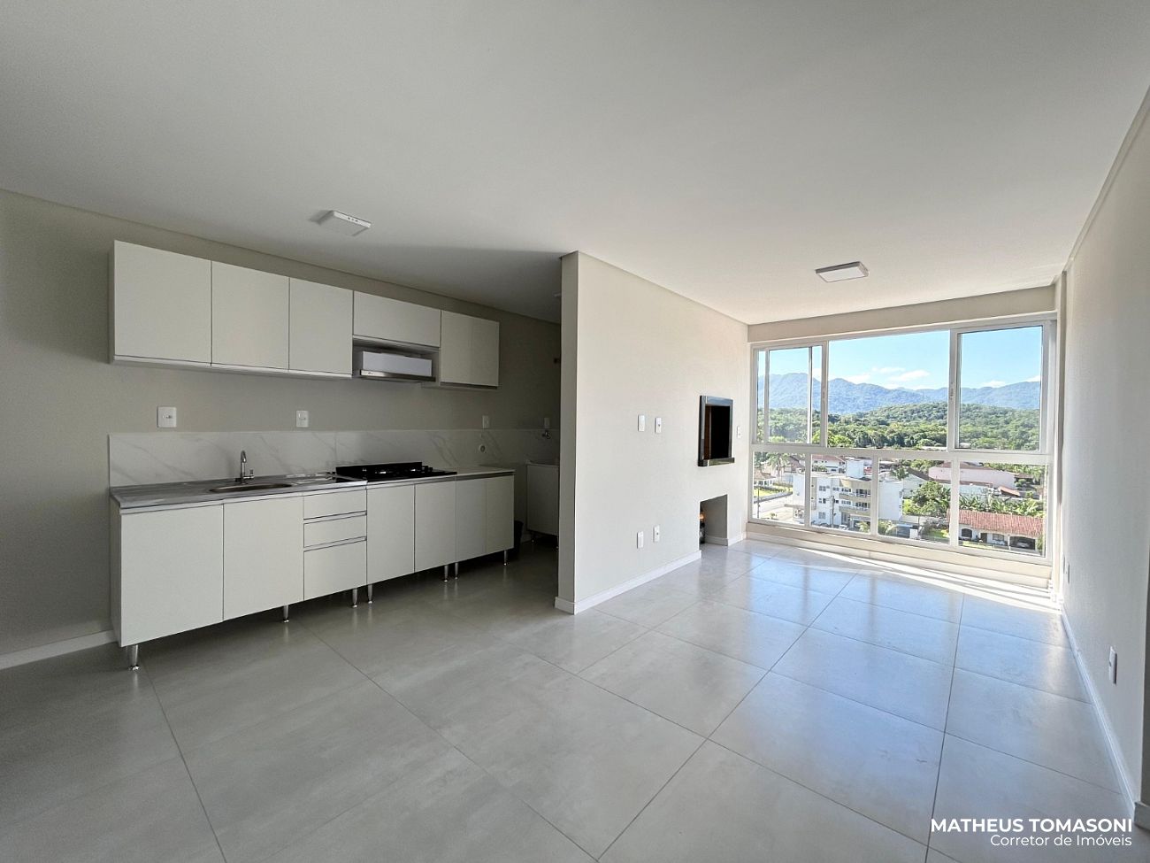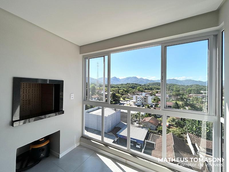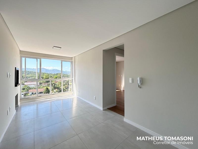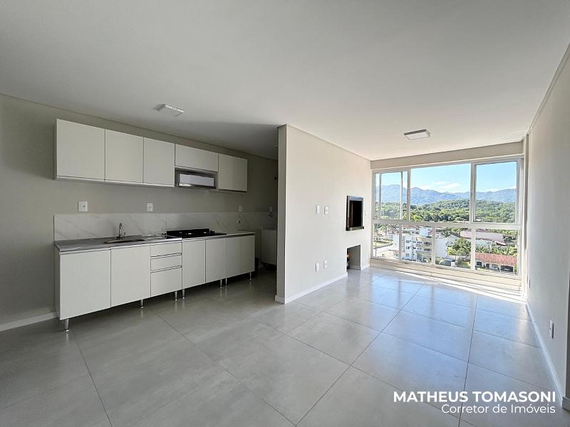 Apartamento de 58m² de área útil, no sétimo andar, de frente para a rua e vista livre para as montanhas. Dispõe de living integrado, churrasqueira à carvão, área de serviço, banheiro social, um dormitório e uma suíte.