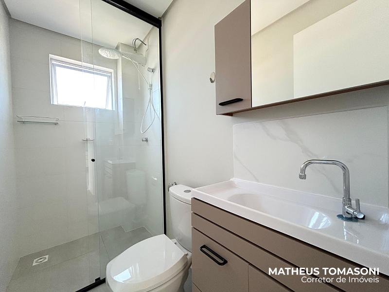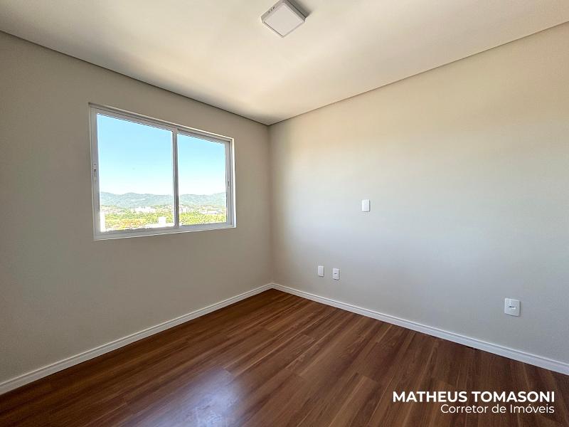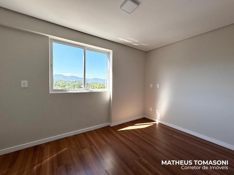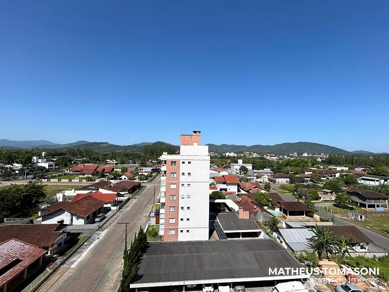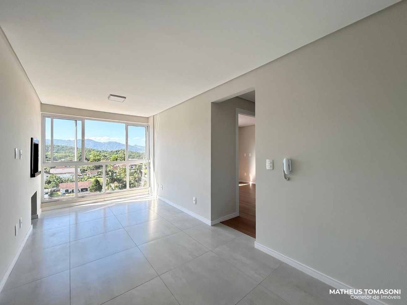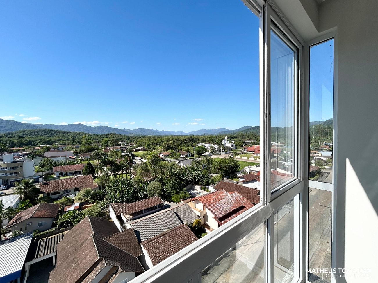 Apartamento de 58m² de área útil, no sétimo andar, de frente para a rua e vista livre para as montanhas. Dispõe de living integrado, churrasqueira à carvão, área de serviço, banheiro social, um dormitório e uma suíte.