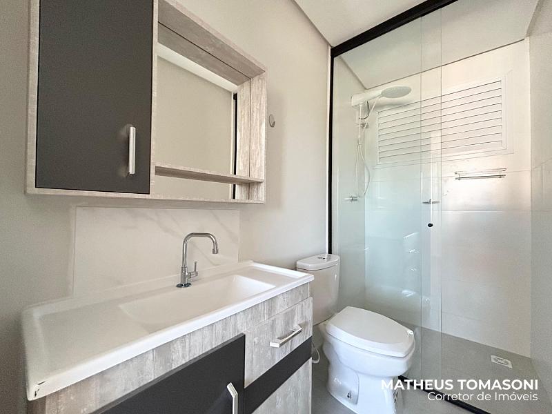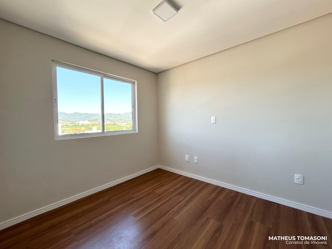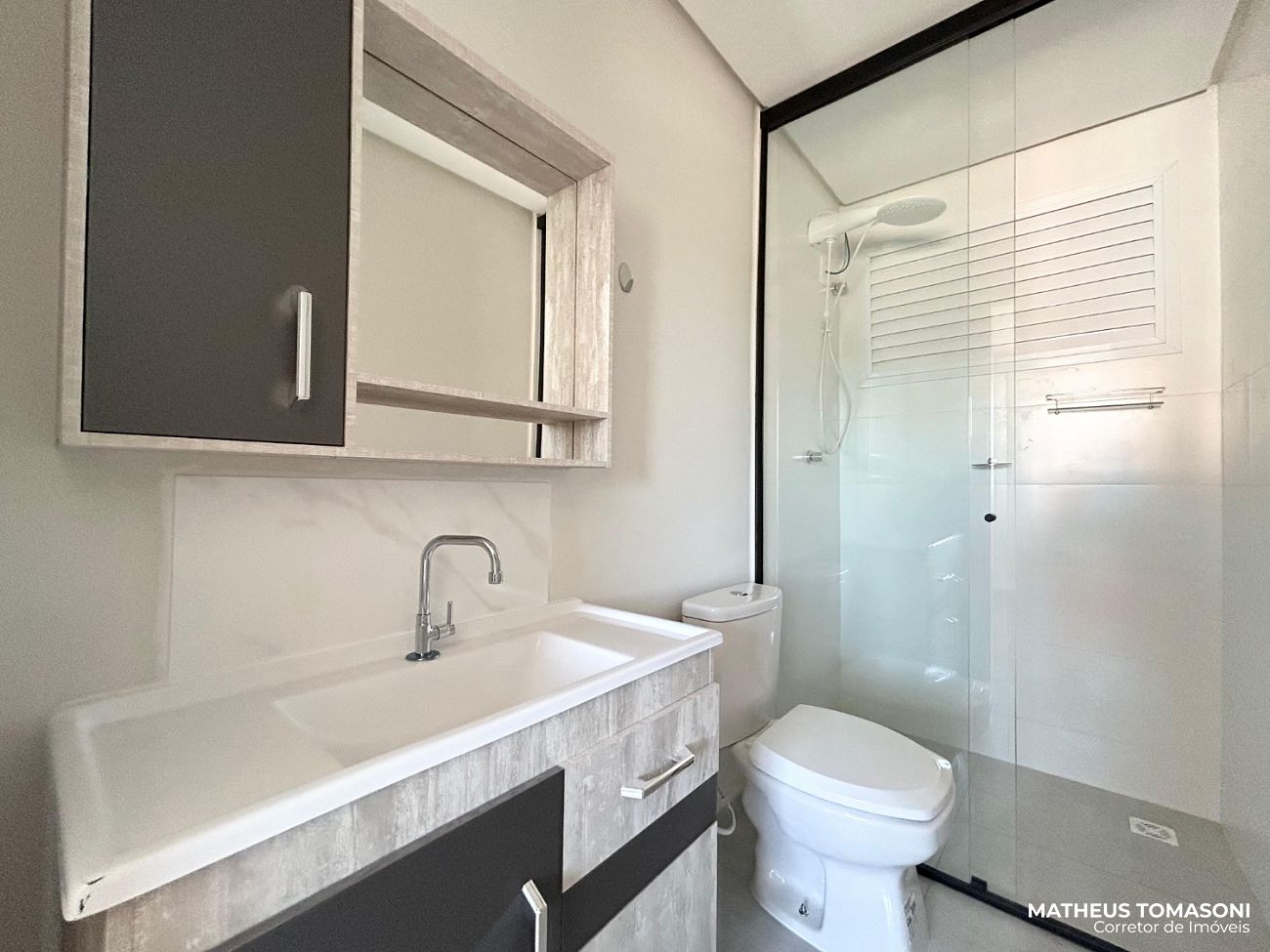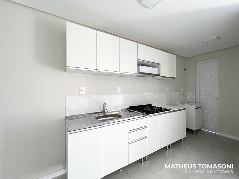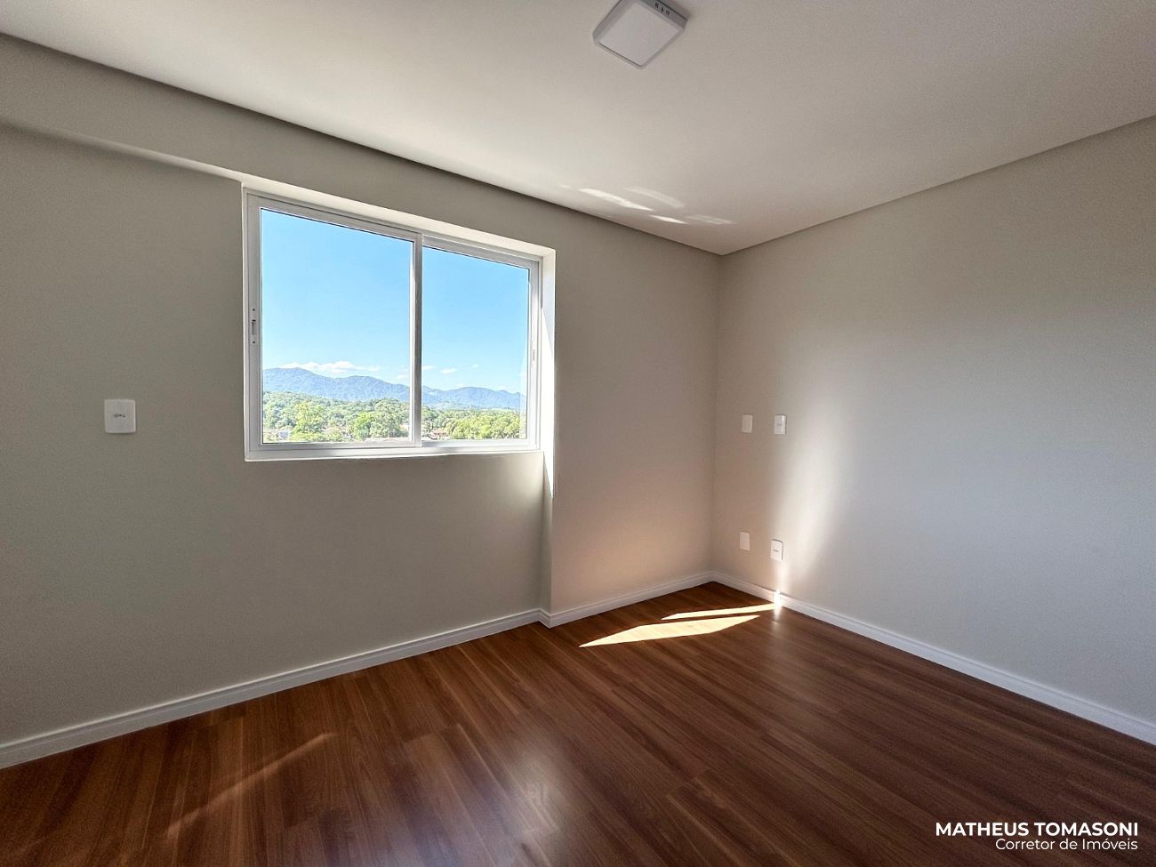 Apartamento de 58m² de área útil, no sétimo andar, de frente para a rua e vista livre para as montanhas. Dispõe de living integrado, churrasqueira à carvão, área de serviço, banheiro social, um dormitório e uma suíte.