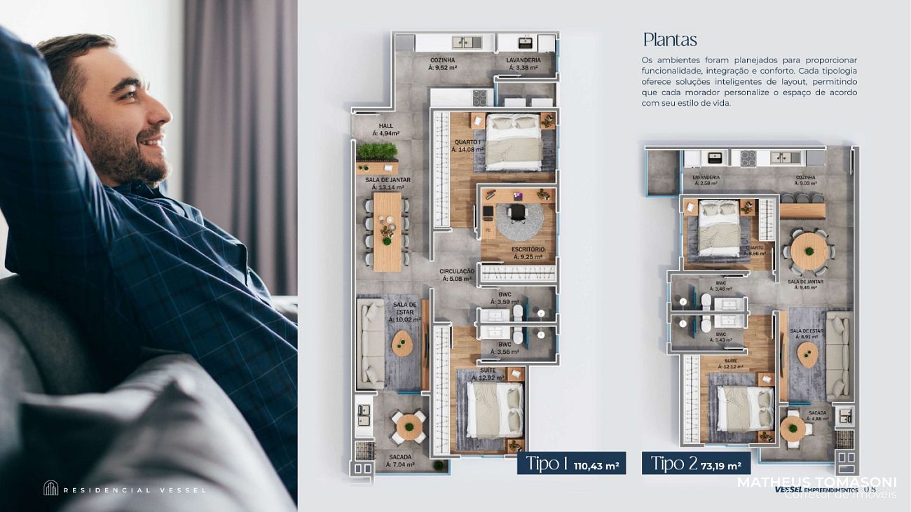 Disponíveis também apartamentos de 73m² com uma suíte e um dormitório.