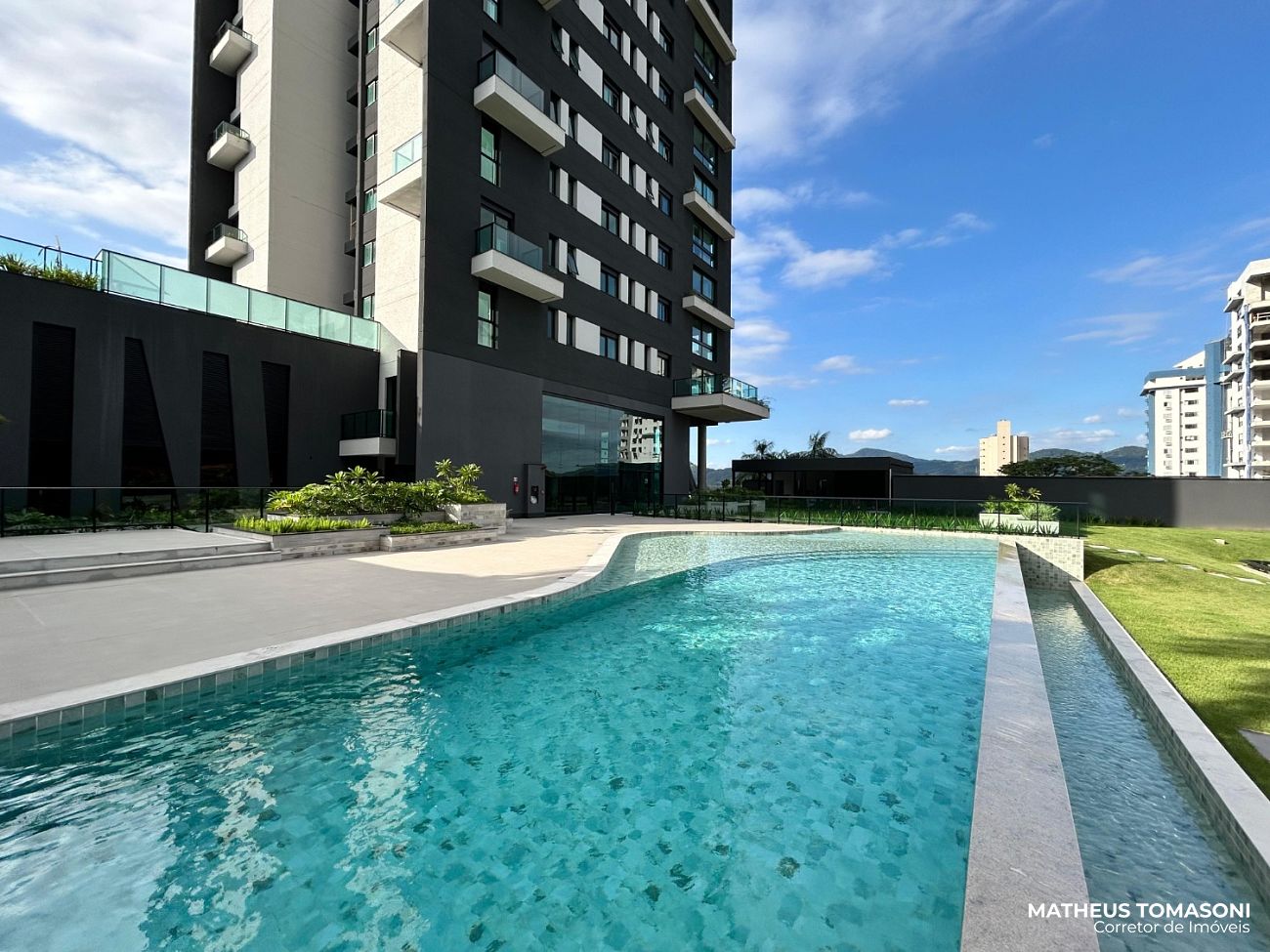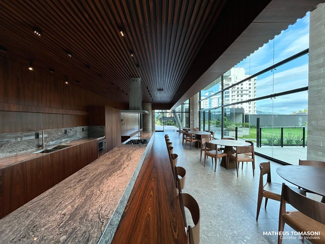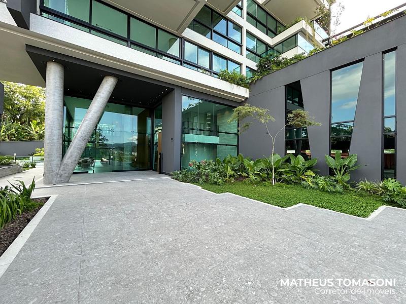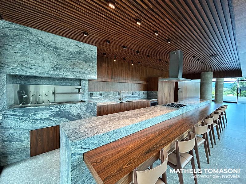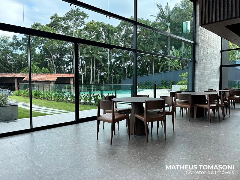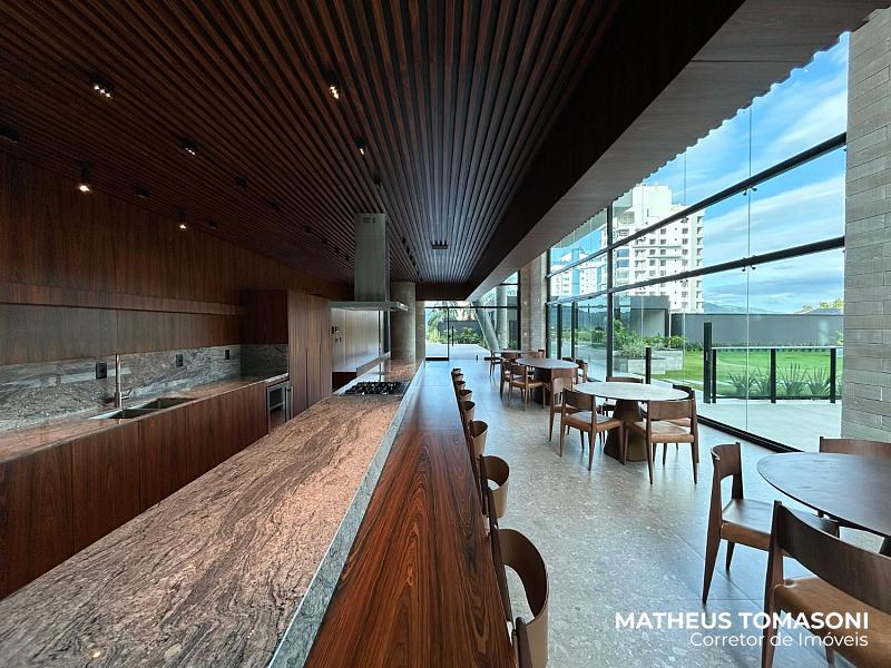 Oferece uma área social com cinco ambientes: sala de TV, sala de estar, sala de jantar, sacada generosa e uma cozinha com churrasqueira à carvão, ambientes envidraçados com vista panorâmica que transforma as janelas em obras de arte.