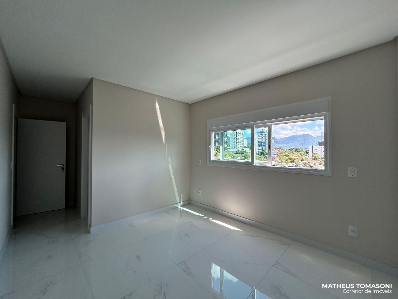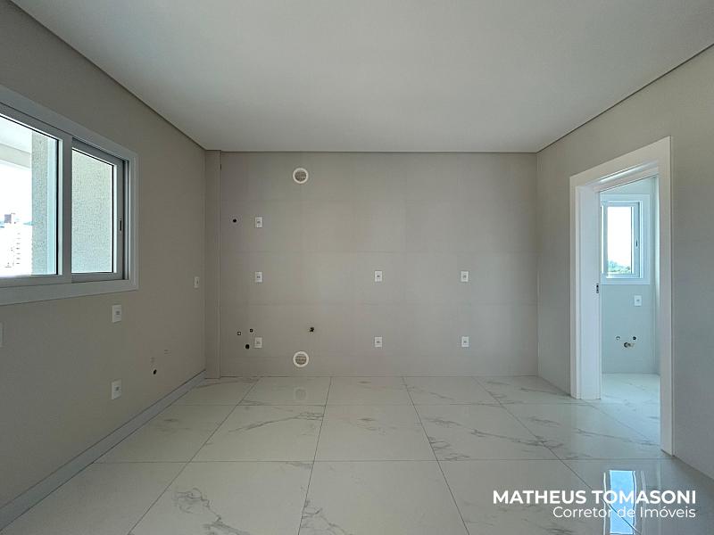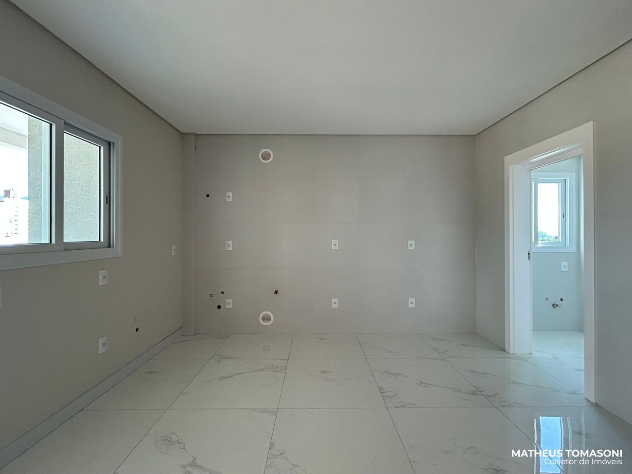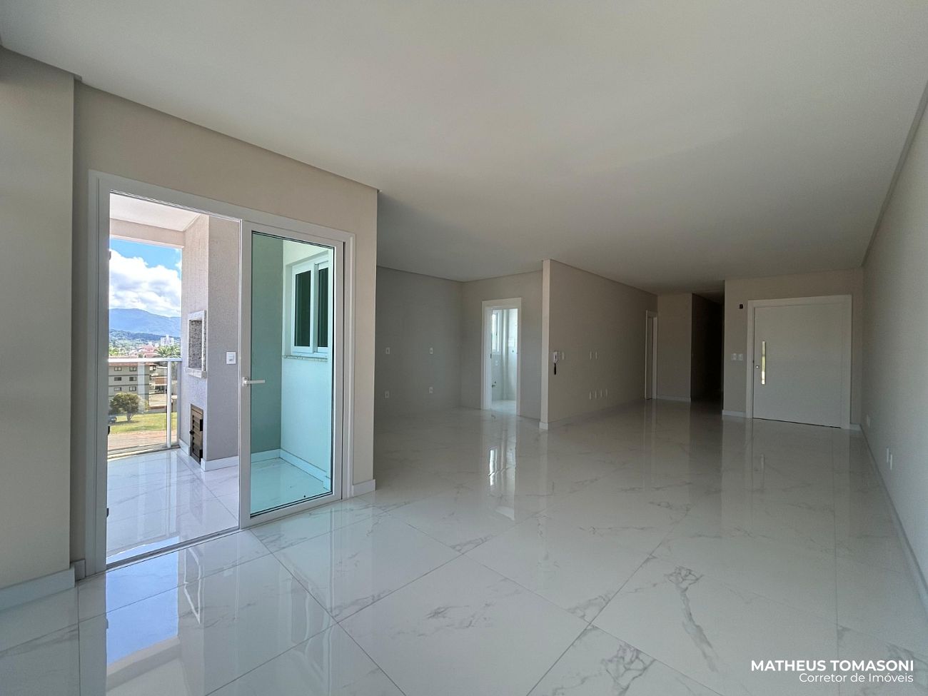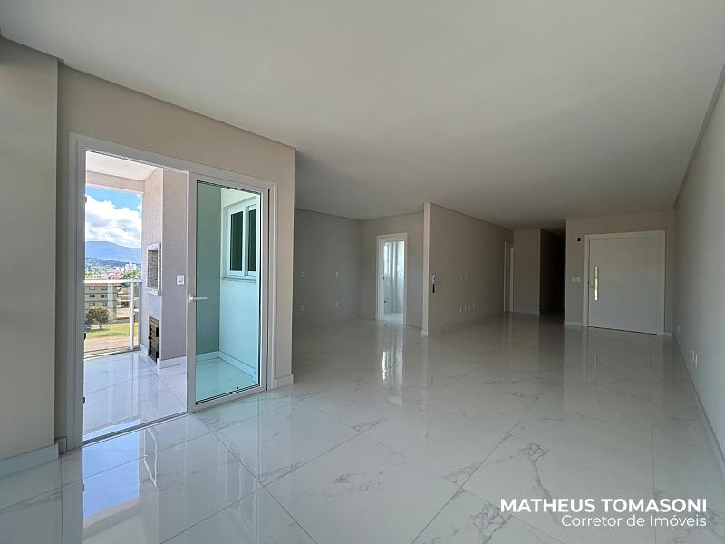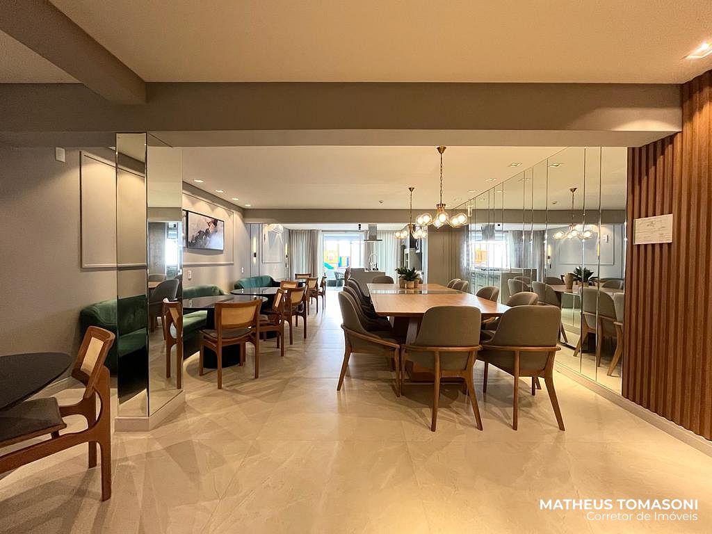 Apartamento com 160m², living integrado com pele de vidro, sacada aberta com churrasqueira, área de serviço ampla, lavabo e três suítes, sendo a principal com espaço de closet. Oferece três vagas de garagem boas.