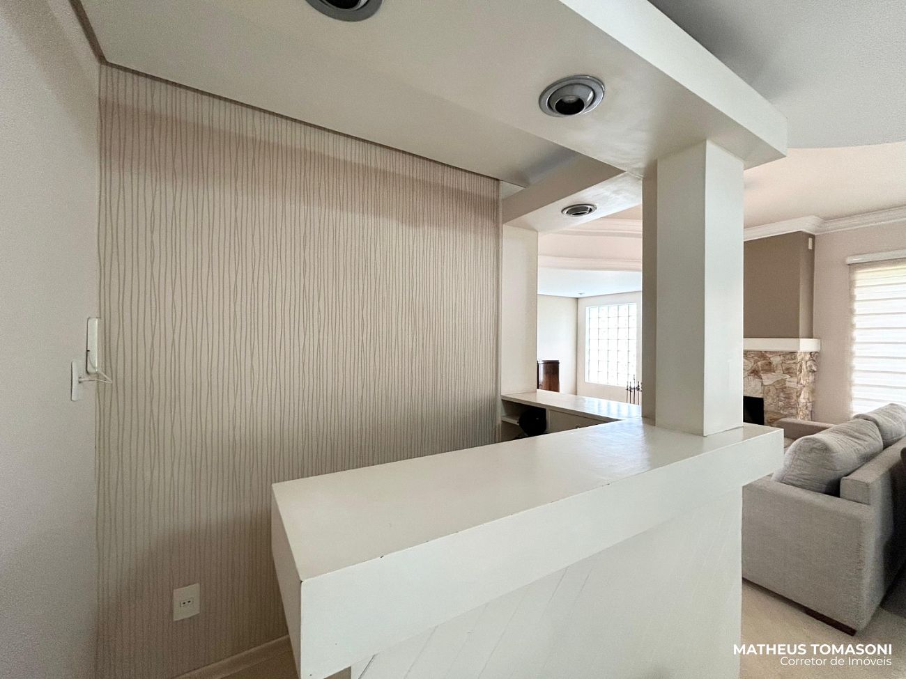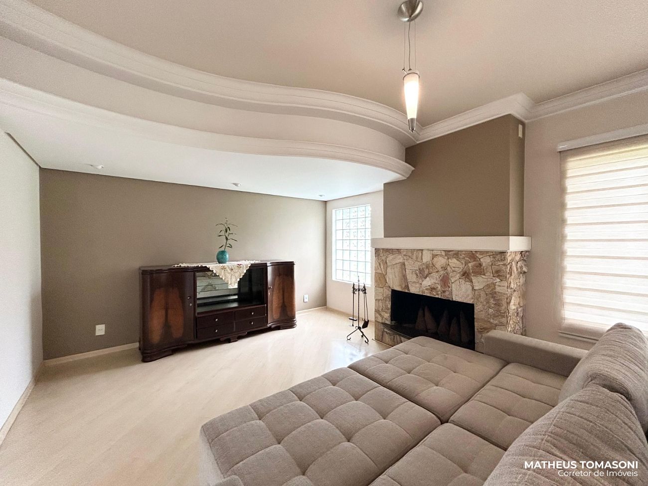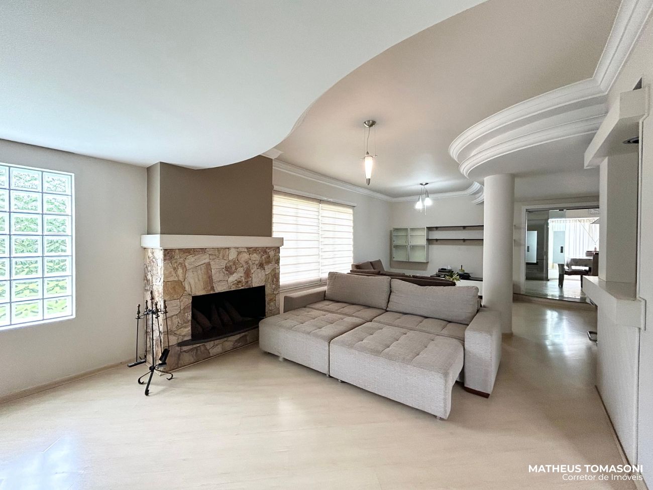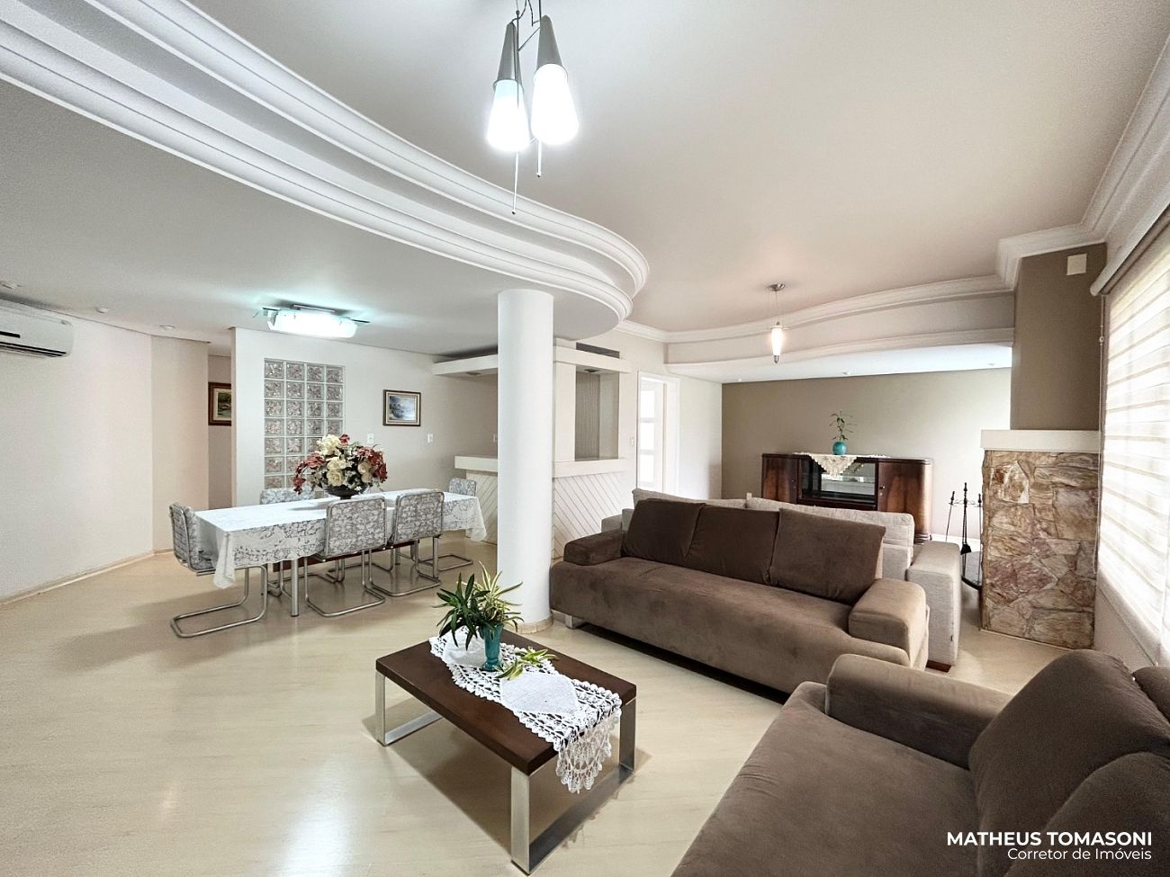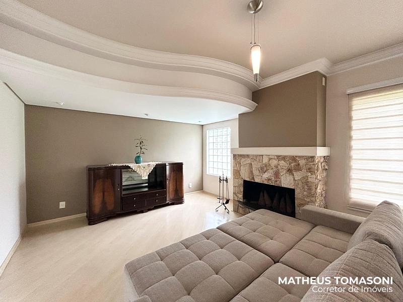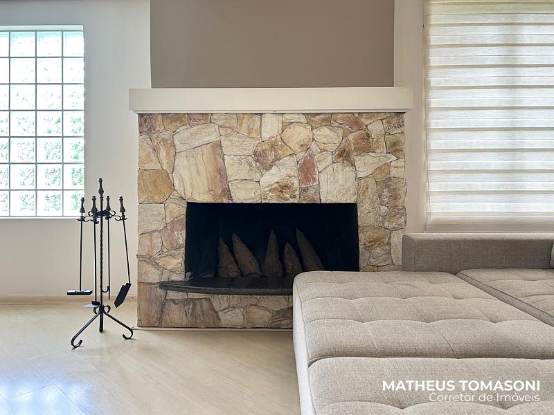 Pavimento térreo: Um hall de entrada e sala de estar ampla e generosa com lareira e espaço de bar/café, cozinha com ilha e sala de jantar, lavabo.