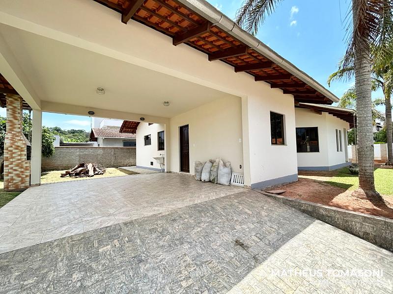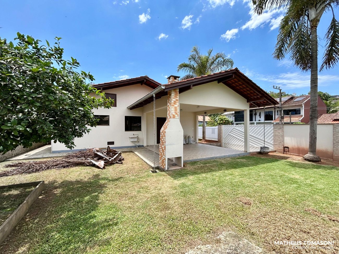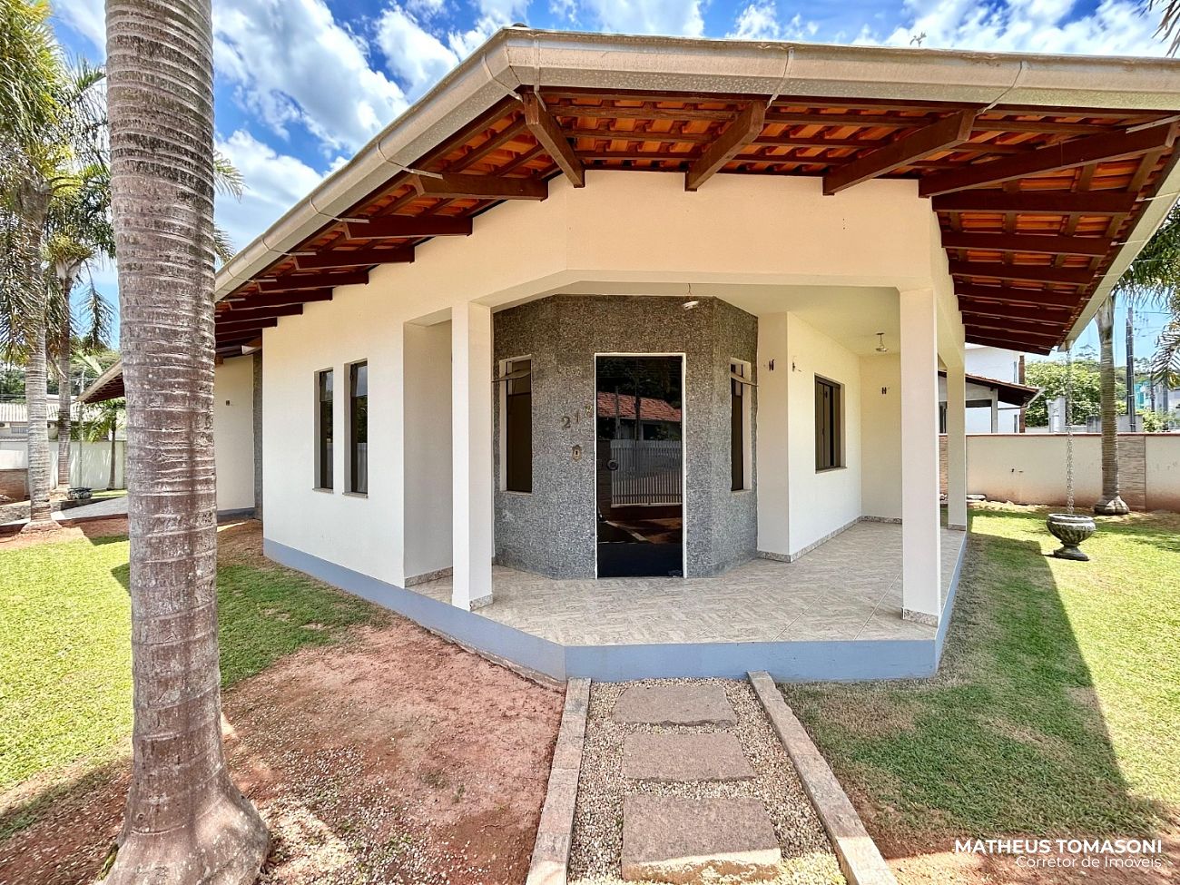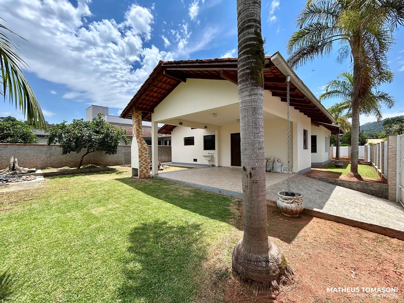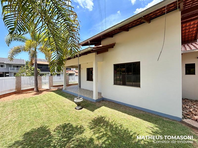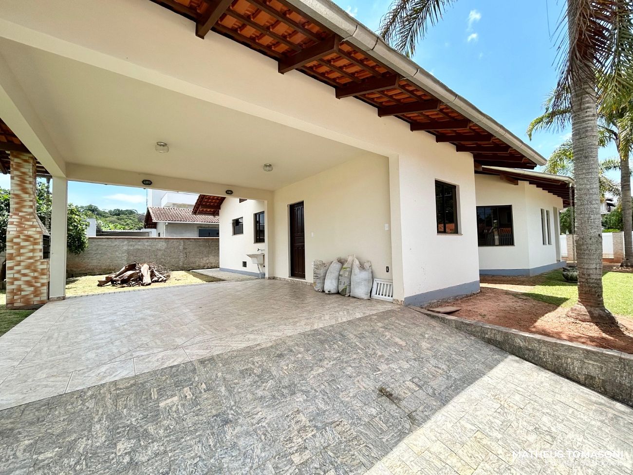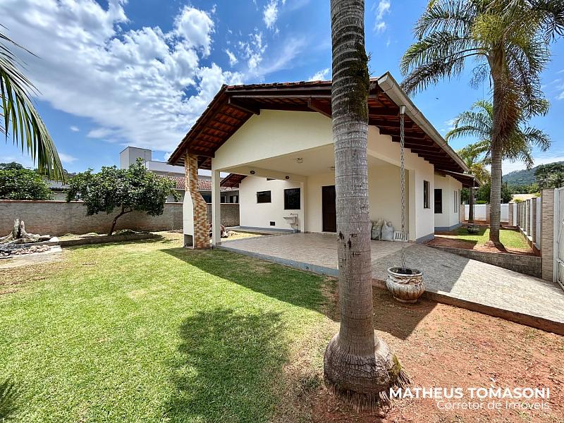 Dispõe de sala de TV, sala de jantar, cozinha, despensa, área de serviço, banheiro social, dois dormitórios e uma suíte com banheira de hidromassagem. Garagem coberta para dois carros e mais espaço de pátio.