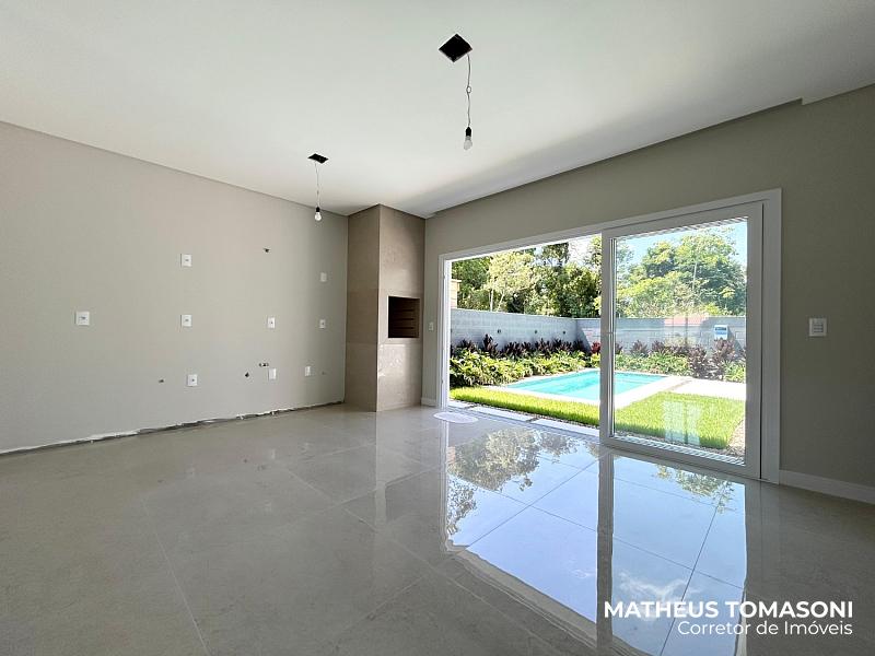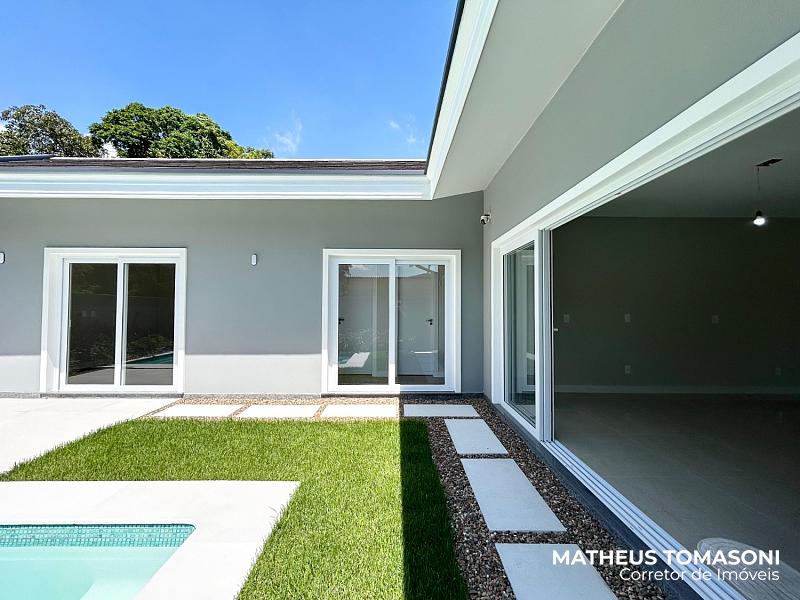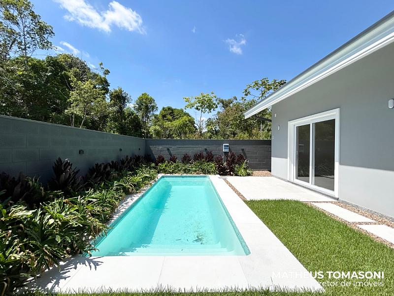 Dispõe de living integrado com a cozinha, um banheiro social, uma área de serviço, dois dormitórios e uma suíte generosa com acesso ao quintal onde se encontra uma linda piscina.